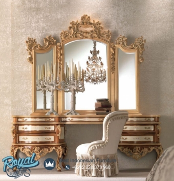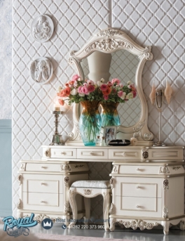 New Design Meja Rias Klasik Eropa Ukiran Jepara Davinci – Meja rias mewah modern ini juga di Finishing dengan Finishing Natural Combi Gold Duco (NC) yang sangat halus dan warna tahan lama sehingga menambah kualitas pada produk meja rias jepara terbaru ini.