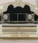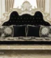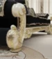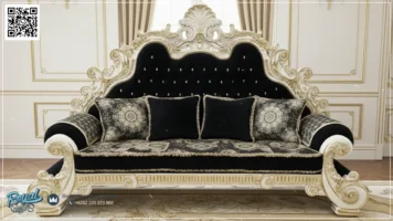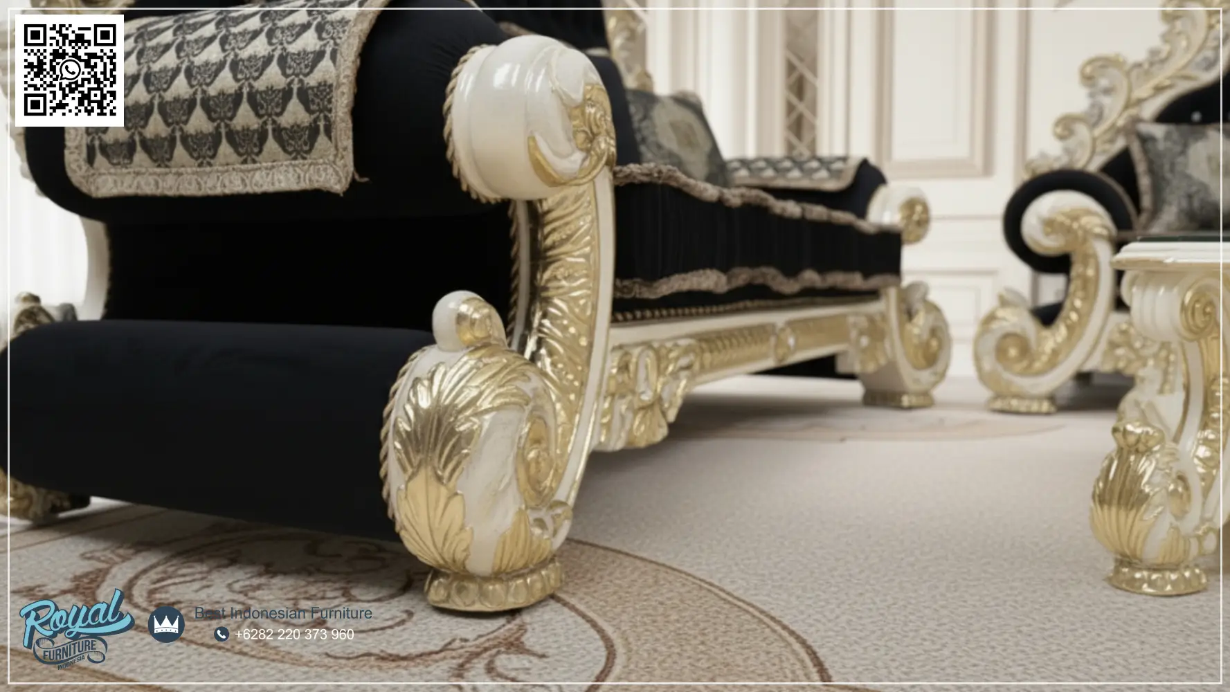 - Detail pinggiran sofa dihiasi dengan ukiran emas berlapis, memperlihatkan kontras yang dramatis namun tetap anggun.