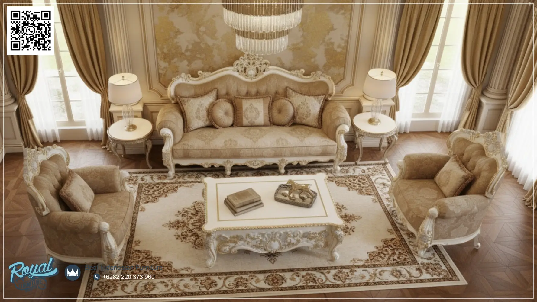 Sofa Ruang Tamu Modern Royal Klasik Mewah Terbaru dirancang untuk anda yang ingin menghadirkan kesan elegan tanpa terlihat berlebihan. Model klasik dengan detail ukiran halus ini memberi nuansa mewah yang terasa hangat dan nyaman, cocok untuk ruang tamu utama maupun ruang keluarga dengan konsep klasik atau semi-klasik.